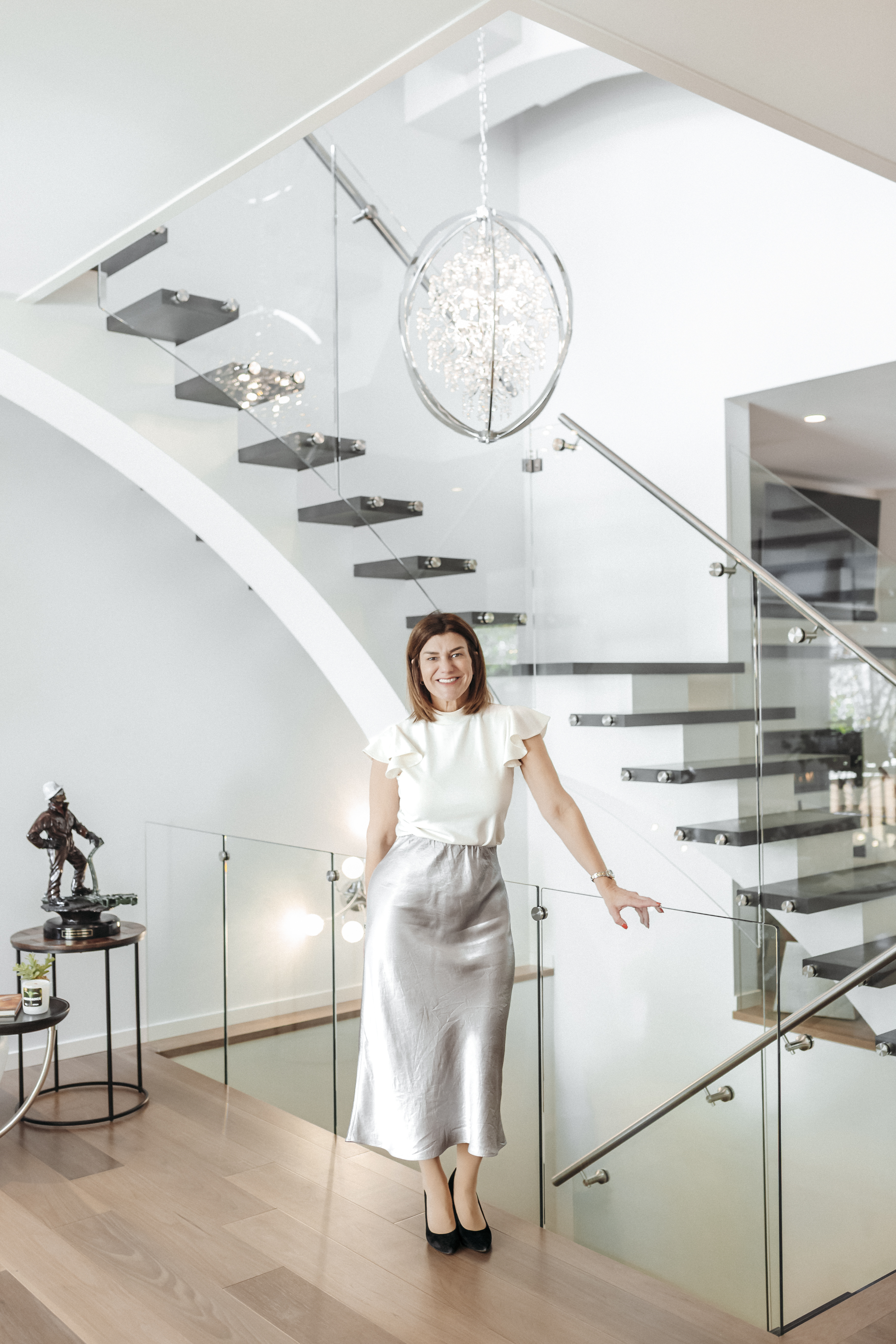 A sculptural glass staircase and dual elevators connect each level.